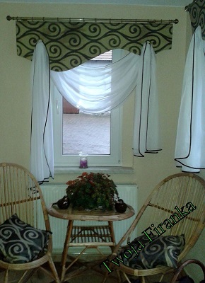 Lambrekiny wykonane z materiału zasłonowego usztywnionesztywnikiem krawieckim oraz szprosami. Ozdobione szalem z woalu obszytego