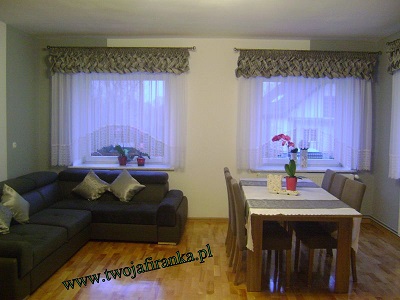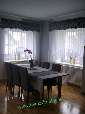 Warkocz wykonany z materiału zasłonowego w kolorzepopielatym z delikatnym białym wzorem. Wysokość warkocza 30cm. Firana wykonana z białego woalu z doszytą 30cm gipiurą.Dekoracja uszyta do tzw. łuku.Zestaw na karnisz 200cm. Wysokość firany w najdłuższejczęści 150cm w najkrótszej 120cm. Do zestawu w komplecie bieżnik na stół oraz poduszki z tegosamego materiału zasłonowego.