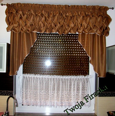 Lambrekin wykonany z materiału zasłonowego. Uszyty na taśmiemarszczącej obszyty lamówką. Układany ręcznie. Zasłonki uszyte na taśmie marszczącej, obszyte lamówką. Zestaw wykonany do salonu z wykuszem oraz z drzwiamitarasowymi. Salon połączony z kuchnią.