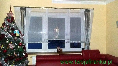 Całość kompozycji wykonana na karnisz o szerokości 240 cm i200 cm.Do uszycia zasłon i paneli wykorzystano dwa rodzaje tkaniny.Zasłony uszyte z tego samego materiału w kolorze srebrnymoraz białym.Tuby upinające zasłony usztywnione oraz ozdobione taśmą zcyrkonii w kolorze srebrnym.Panele usztywnione szprosami. Udekorowane ozdobnymi, kryształowymikulami oraz taśmą z cyrkonii w kolorze srebrnym.